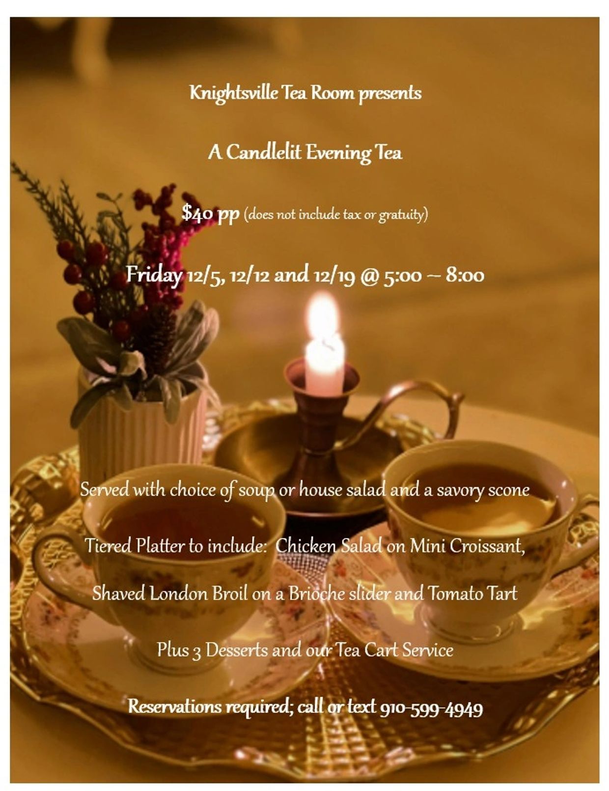 Call or text to make your reservation 910-599-4949 or knightsvilletearoom@gmail.com