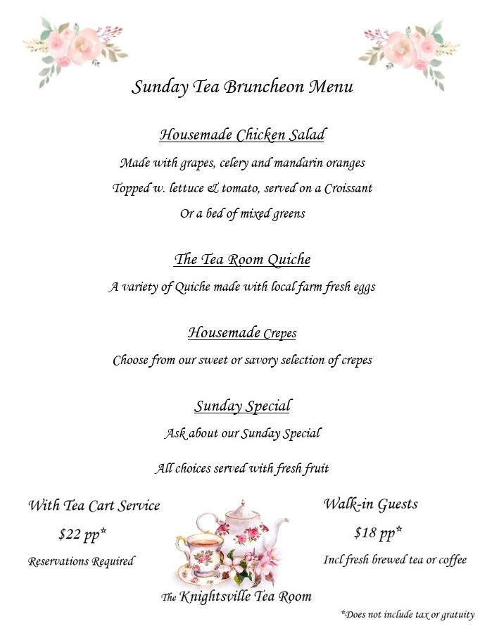 Call or text 910-599-4949 or email knightsvilletearoom@gmail.com